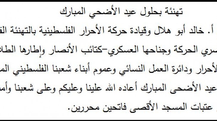 يتقدم الأمين العام أ. خالد أبو هلال وقيادة حركة الأحرار الفلسطينية بالتهنئة القلبية الحارة من أبناء وكوادر ومناصري الحركة وجناحها العسكري-كتائب الأنصار وإطارها الطلابي-كتلة الأحرار الطلابية وطلائع الأحرار ودائرة العمل النسائي وعموم أبناء شعبنا الفلسطيني المجاهد وأمتنا العربية والإسلامية بحلول عيد الأضحى المبارك أعاده الله علينا وعليكم وعلى شعبنا وأمتنا بالخير واليمن والبركة ونحن على عتبات المسجد الأقصى فاتحين محررين.