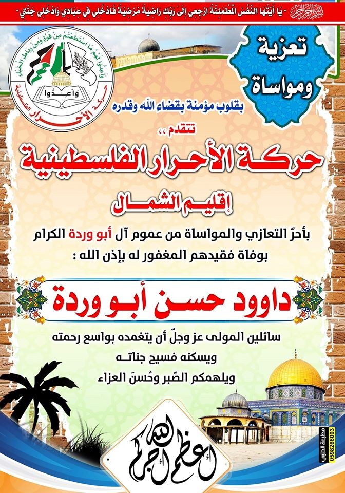 حركة الأحرار الفلسطينية إقليم الشمال تؤدي واجب العزاء لذوي ال شه يد داود حسن أبو وردة