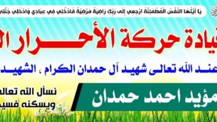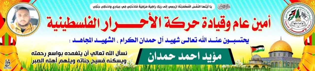 تتقدم حركة الأحرار الفلسطينية إقليم الشمال بخالص العزاء والمواساة لآل حمدان الكرام باس تشهاد الشه يد البطل مؤيد حمدان سائلين المولى ان يسكنه الفردوس الأعلى