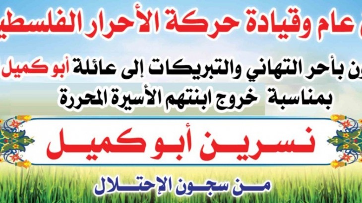 حركة الأحرار الفلسطينية قيادة إقليم غرب غزة تقدم التهنئة والتبريكات للأسيرة المحررة / نسرين أبو كميل بعد خروجها من سجون الإحتلال .