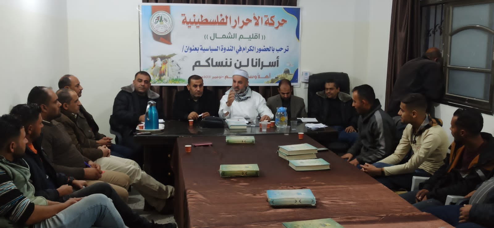 بحضور وفد من قيادة حركة الأحرار الفلسطينية قيادة إقليم الشمال تعقد اجتماعها الدوري بحضور كافة المجالس التنظ يمية لبحث كافة المستجدات السياسية والتنظيمية على الساحة الفلسطينية وسبل تطوير العمل التن ظيمي وتحضيرا لعدد من النشاطات السياسية في المرحلة المقبلة