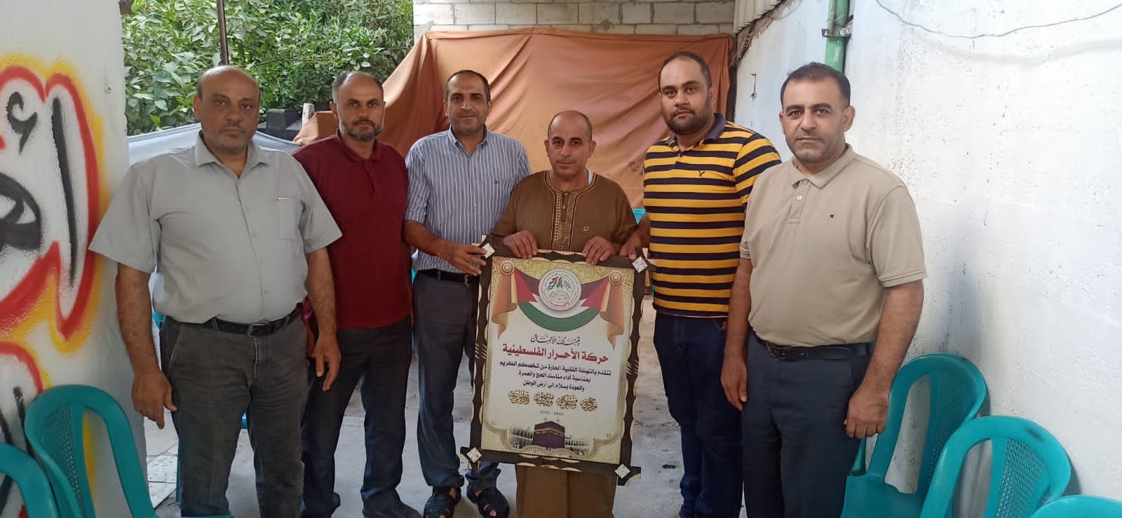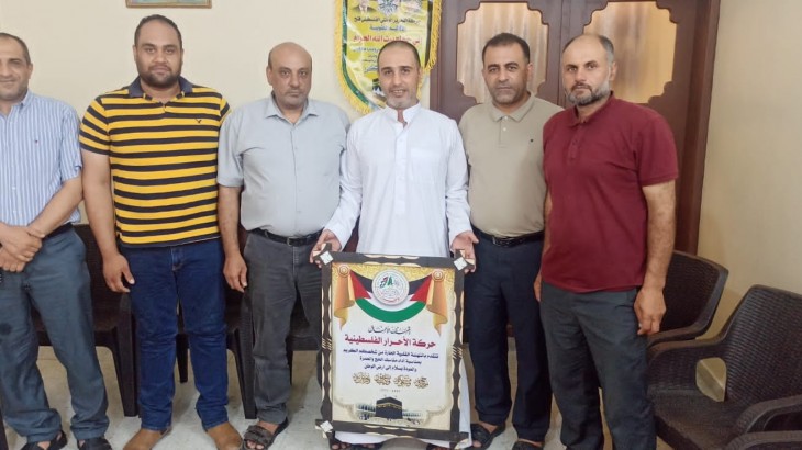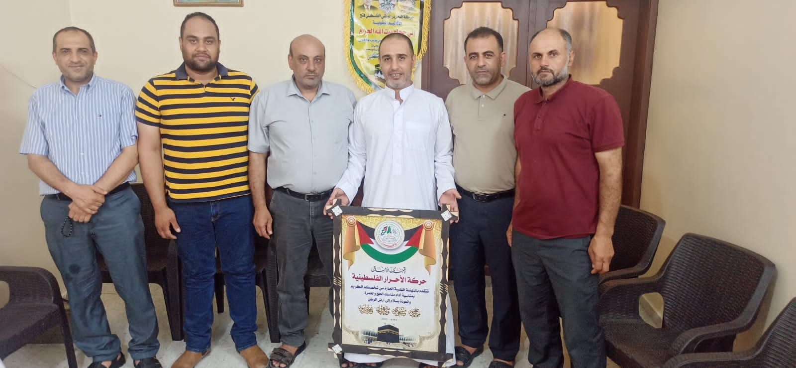 حركة الأحرار الفلسطينية إقليم الشمال تختتم حملة الزيارات الميدانية لتهنئة حجاج بيت الله الحرام بعد عودتهم من مناسك الحج وذلك اليوم الأحد الموافق 24/7/2022 م