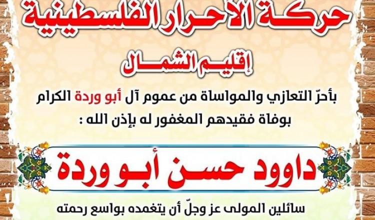 حركة الأحرار الفلسطينية إقليم الشمال تؤدي واجب العزاء لذوي ال شه يد داود حسن أبو وردة